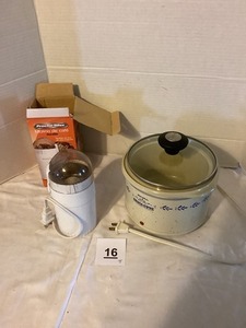 Proctor-Silex durable coffee grinder in original box and small crock pot |