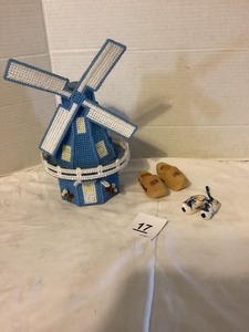 Pair of small wooden shoes, decorative shoes and plastic canvas windmill