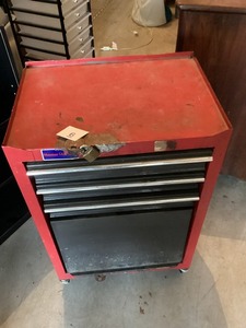 Metal Master Mechanics tool box with three drawers on wheels with some contents