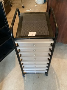 Metal unit on wheels with eight plastic drawers - missing a screw